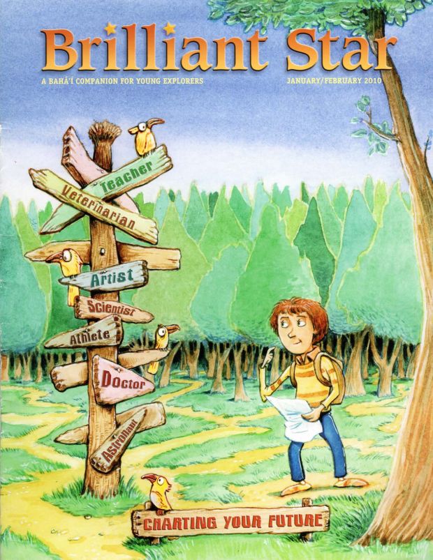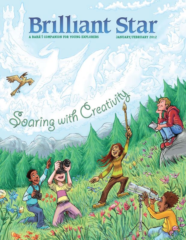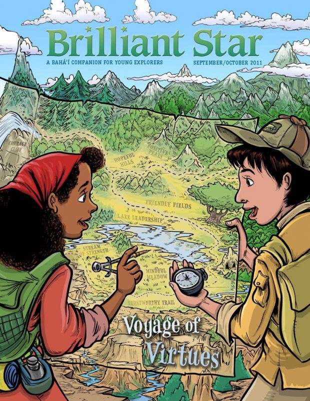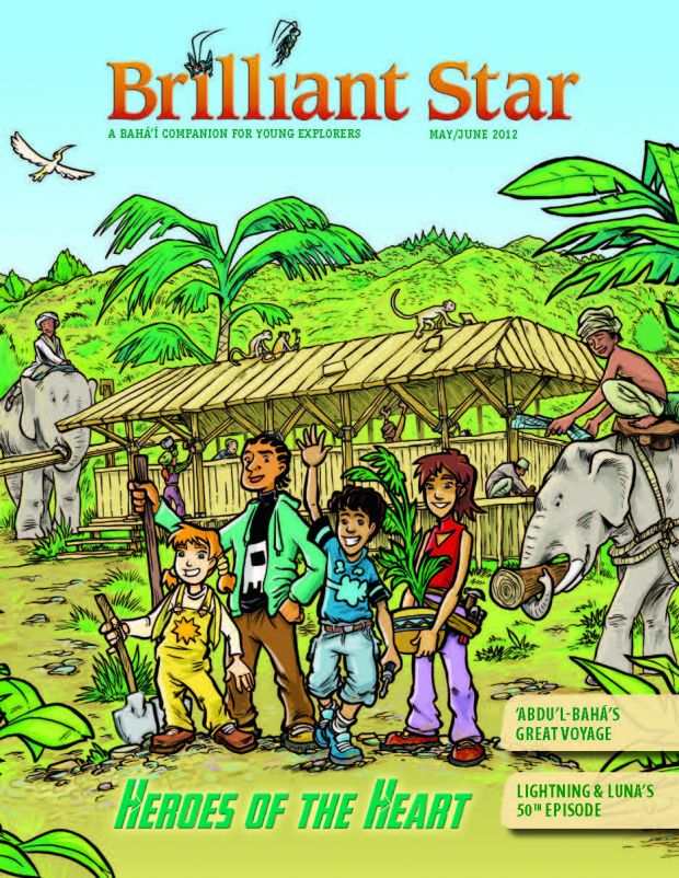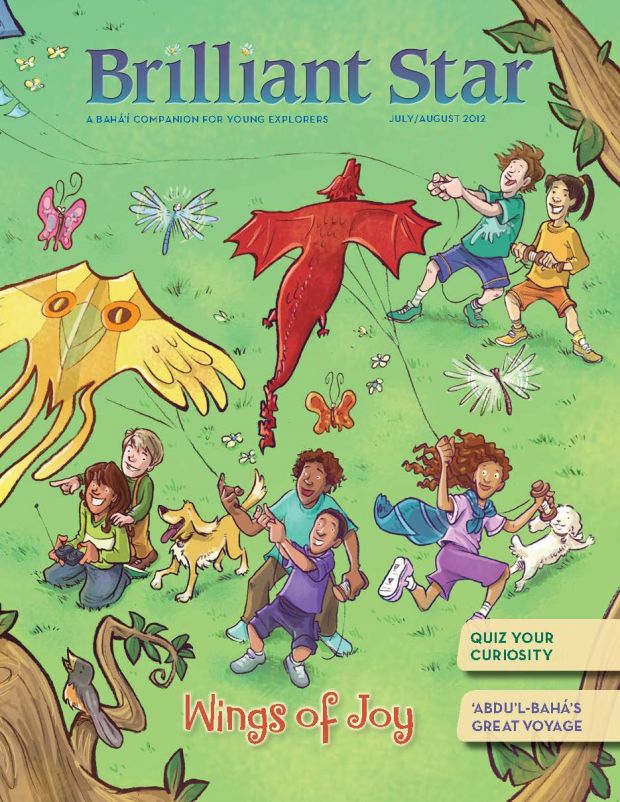 A on giraffe at top left, B in leaves at top center, H in branches at top center, V in grass at center right, O on giraffe at center right, D in water at center, G on tree trunk at bottom left, P in grass at bottom left. “With clear vision we are enabled to struggle onward and upward, ever progressing in the paths of virtue . . . and becoming the means of light to the world.” —‘Abdu’l-Bahá