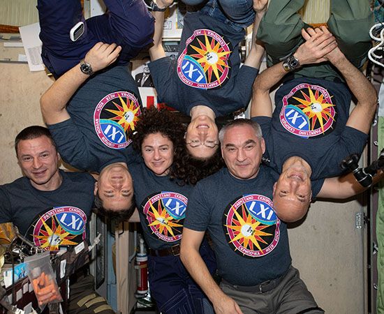 The crew of Expedition 61 aboard the International Space Station in 2019 (left to right): Andrew Morgan, Oleg Skripochka, Jessica Meir, Christina Koch, Alexander Skvortsov, and Luca Parmitano.