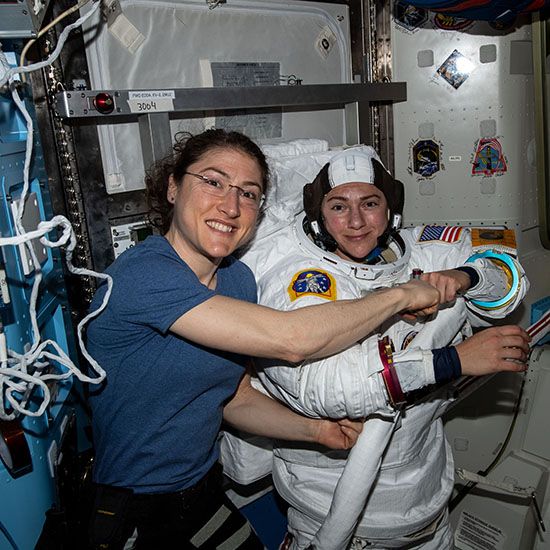Christina and Jessica Meir prepare for their first spacewalk together in 2019.