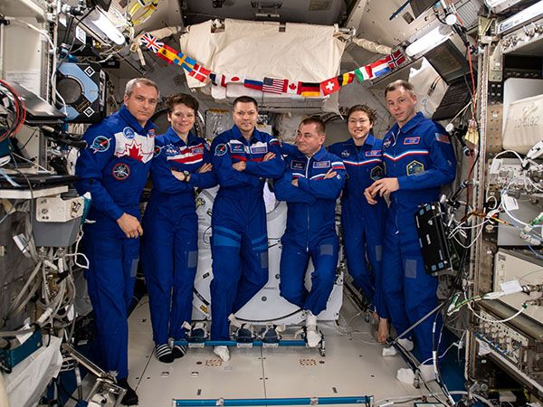 Crew members aboard the International Space Station in 2019 (left to right): David Saint-Jacques, Anne McClain, Oleg Kononenko, Alexey Ovchinin, Christina Koch, and Nick Hague.