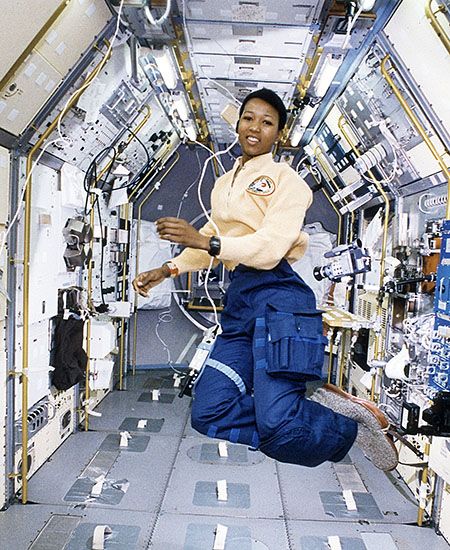 Astronaut Mae Jemison, the first woman of color to travel in space, aboard the Endeavour in 1992.