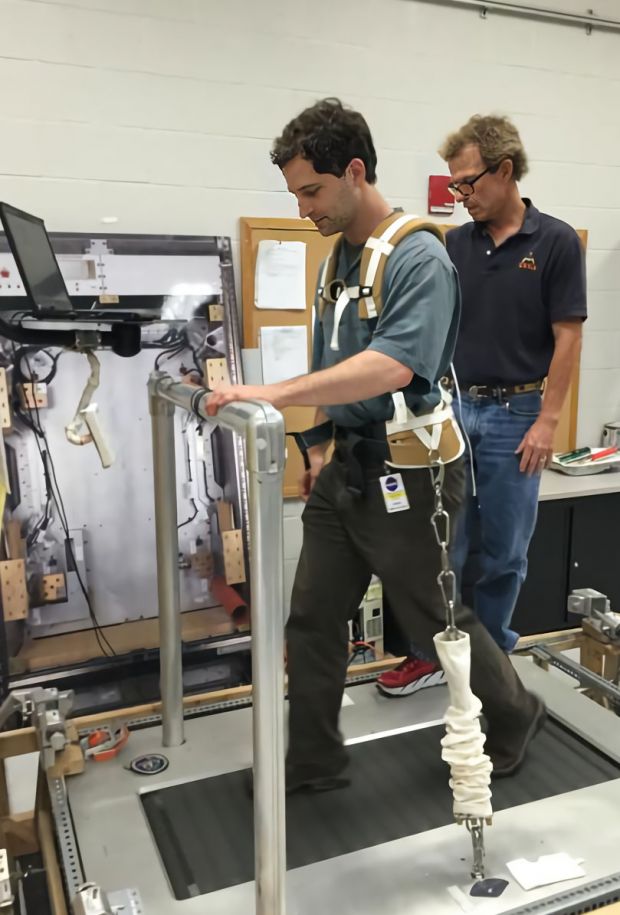 Dr. Levin trains on a “0-G” treadmill at NASA