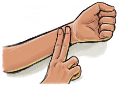1. Sitting calmly, find your pulse by placing two fingers on the inside of your wrist. Count the beats for 15 seconds. Multiply to get your heart rate per minute.