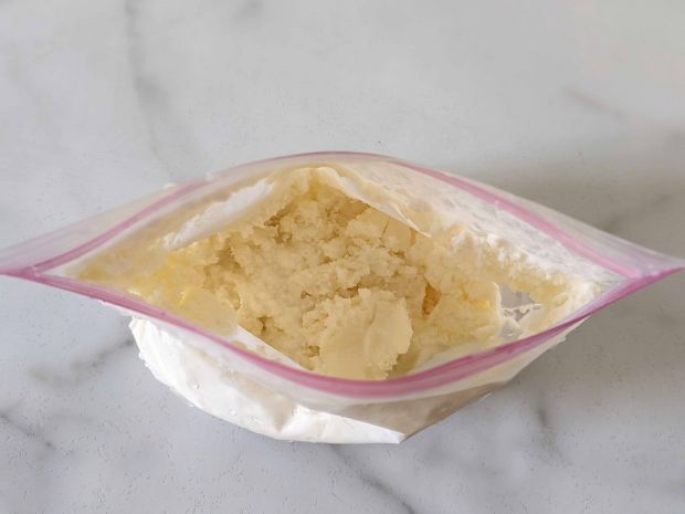 Step 3: Shake gallon bag over sink for 8–10 minutes until mixture thickens, like soft serve ice cream. Remove quart bag from gallon bag. Optional: freeze for two hours for a firmer texture.