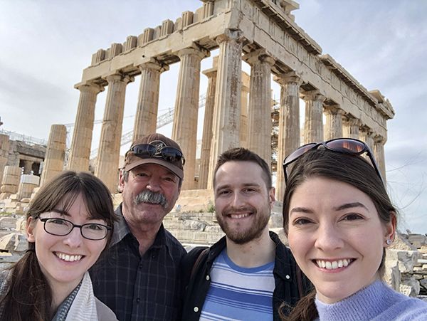 The temples were a sight to see, too. The main temple, called the Parthenon, was dedicated to Athena, the Greek goddess of wisdom, handicraft, and civilization, who was believed to protect Athens. Its proud marble pillars stood like a beautiful grove of fossilized tree trunks. Katie and I were so moved by its beauty that we started waltzing in front of it.
