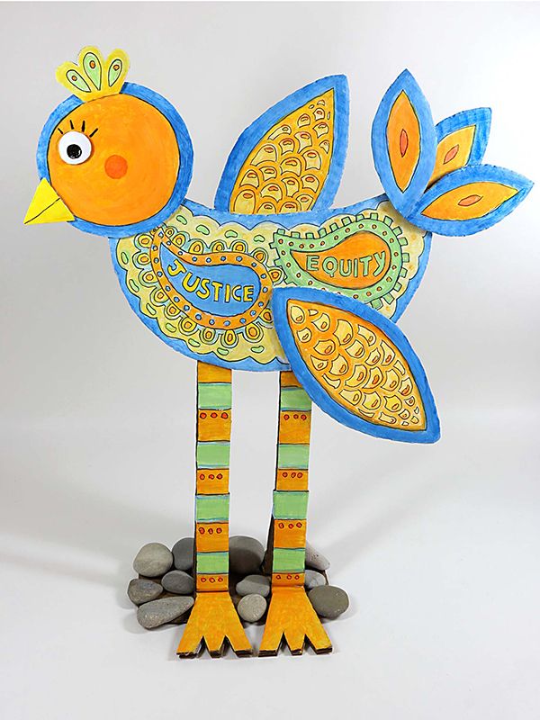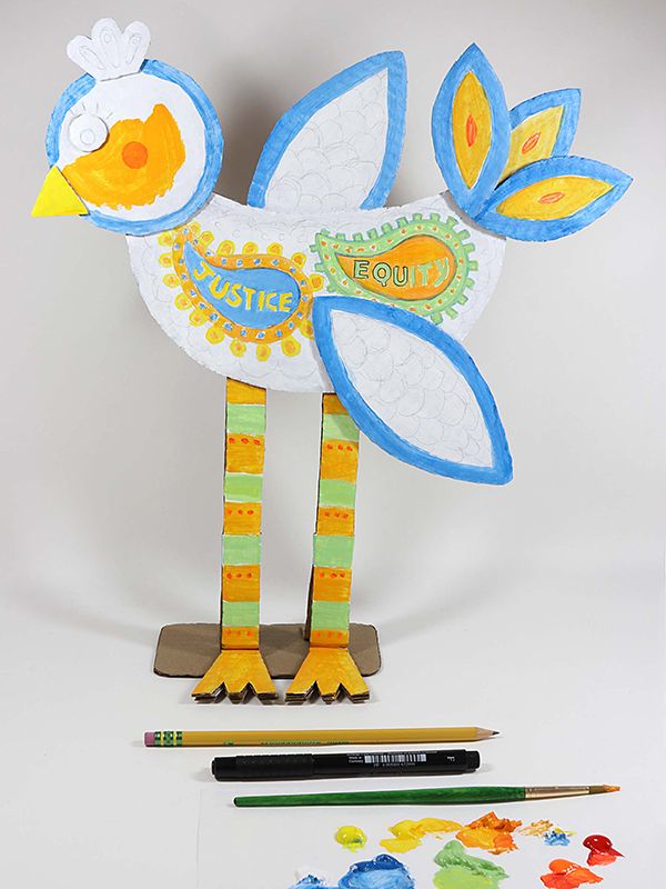 Step 9 B: Carefully draw designs on bird in pencil. Include virtues and images that can uplift your community. Add colorful paint. Let dry. Use black marker for details.