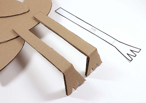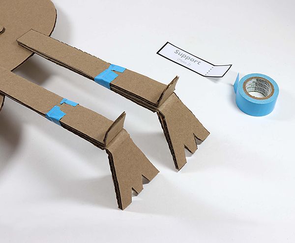 Step 7: Fold right angles at 1" (2.5 cm) from end of each support, to make tabs (shown by dotted line on pattern). Lay supports on legs so tab and feet creases align and folds go in opposite directions. Tape supports to legs.