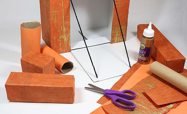 Step 4: Glue wrapping paper to other sides of box, and to smaller boxes and tubes for rooms and towers.