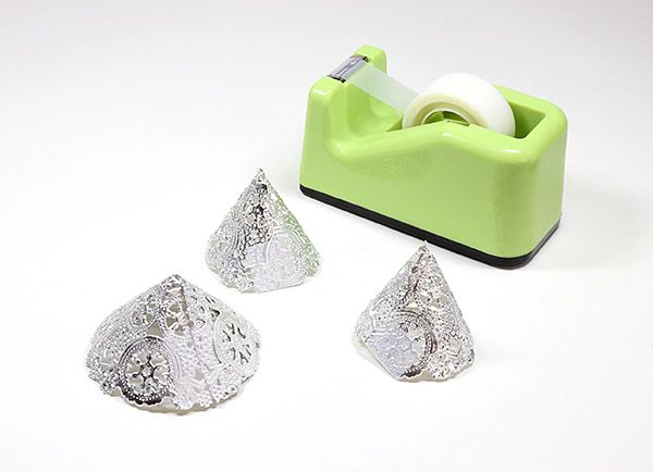 Step 5(b): From corners, wrap cut ends of half or whole circle snugly around each other to form cones. Secure with tape.