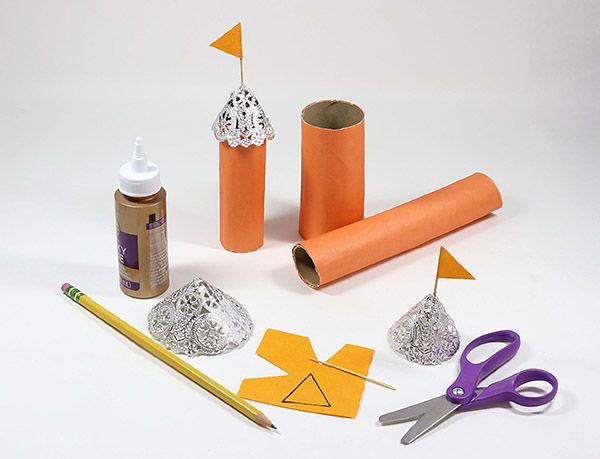 Step 6: For flags, glue 1" (2.5 cm) card stock triangles to toothpicks. Cut tiny portion off tip of some cones and insert flagpoles in openings. Glue flagpoles to cones, and glue cones to towers.