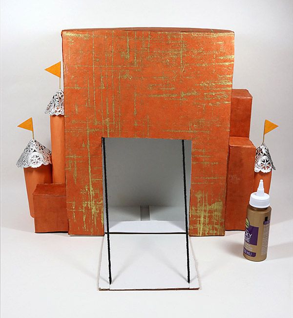 Step 3(a): Cut slits ½" (1.3 cm) from each top corner of drawbridge. Thread strings through slits, so most of each string is inside castle. Tape short ends to drawbridge.