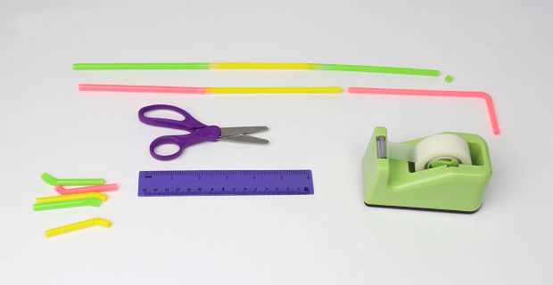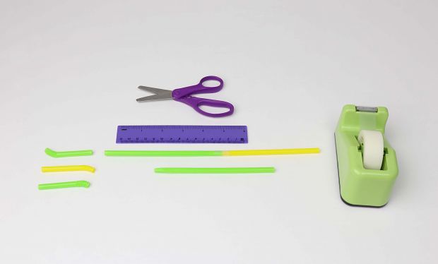 Step 1: Cut off any bendable portions of straws. Link two straws by pinching end of one straw and fitting it inside end of another. Reinforce with tape. Repeat and trim, if needed, to make a 15" (38.1 cm) straight stick.
