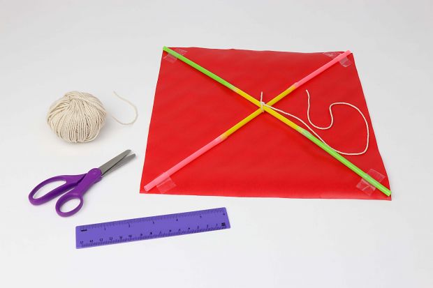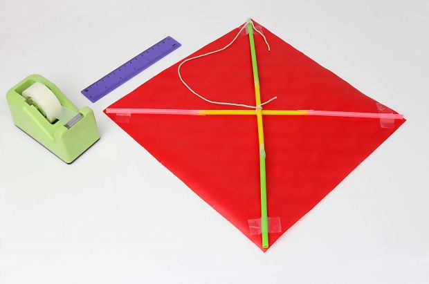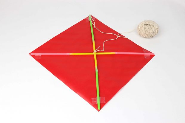 Step 3: Center two sticks in a plus-sign shape on wrapping paper, so each stick end touches one of kite’s corners. Secure sticks with tape, about ½" (1.3 cm) from straws’ ends.