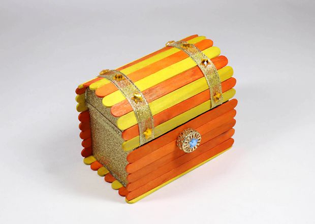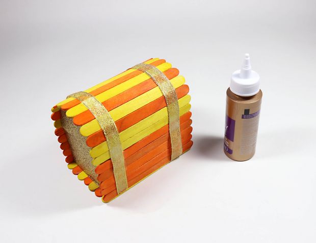 Step 6b: Cover curved edge of each small cardboard piece with glue. Center each gluey edge upside down, ¼" (0.6 cm) from ends of sticks. Carefully wrap sticks around edges of both curves to form arced lid of chest. Cup hands underneath to support arc. When dry, remove tape.
