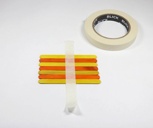 Step 6a: Place twelve sticks in an even row. Tape across center of row to secure sticks. Place two more tape pieces about ½" (1.3 cm) from central strip on each side.