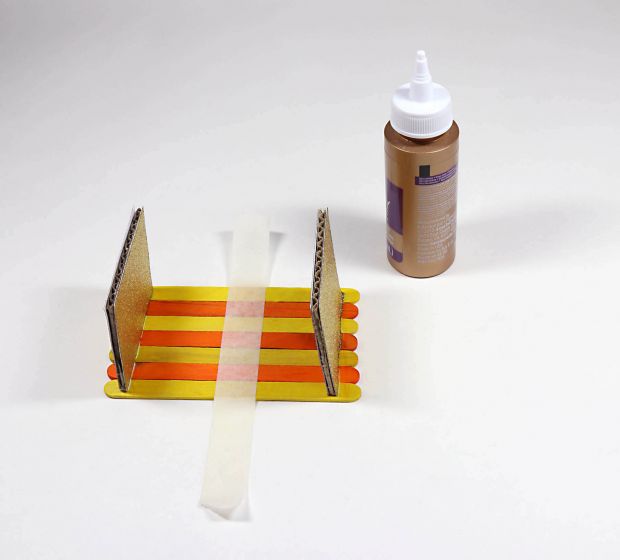 Step 4: Cover one long edge of both cardboard rectangles with glue. Center each gluey edge ¼" (0.6 cm) from scalloped end of sticks. When dry, remove tape.