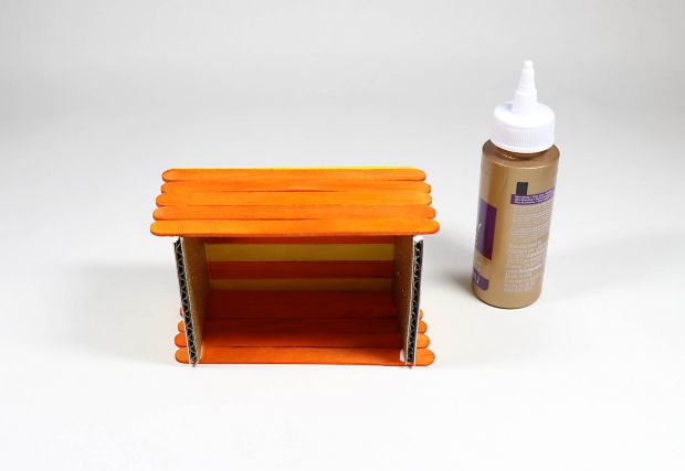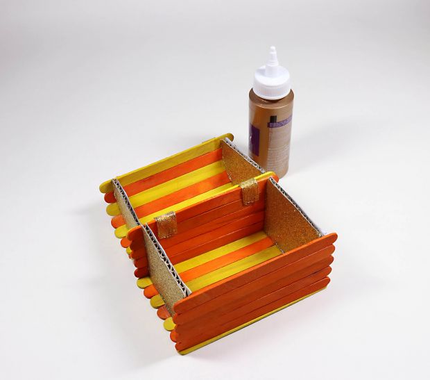 Step 5a: Turn bottom of box on its side so short ends of cardboard face upward. Glue five sticks centered on short edges of cardboard, to form a side of box. Let dry.