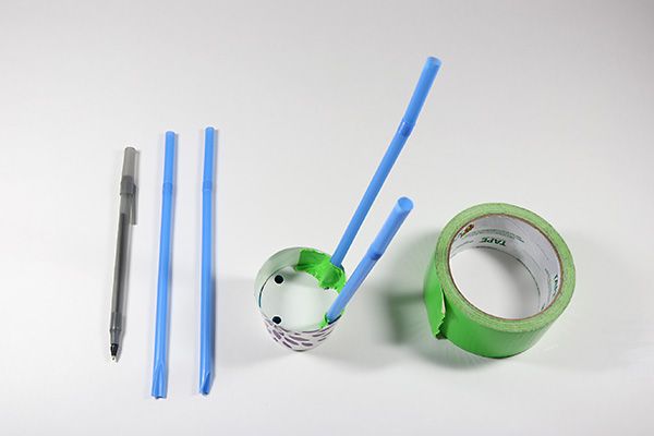 Step 7b: Turn balloon upside down. Pinch straw ends closed and thread straws through holes, stopping at tape. Turn balloon right side up and balance it evenly on taped parts of straws.