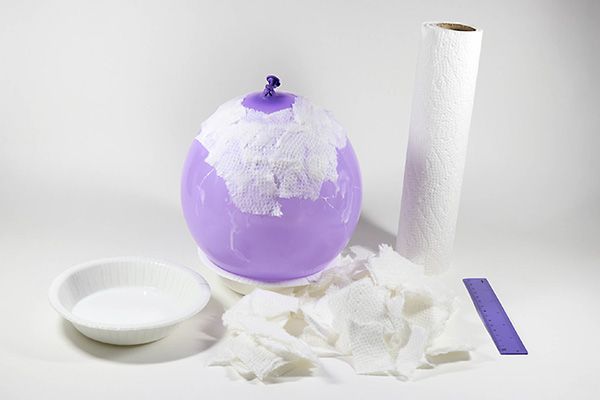 Step 4b: Tear paper towel into stamp-sized pieces. Coat pieces in glue mixture. Without covering 1" (2.5 cm) around knot, cover rest of balloon with 2 or 3 smooth layers. Let dry 1–2 days. Rotate balloon now and then so it dries evenly and won’t stick to bowl.