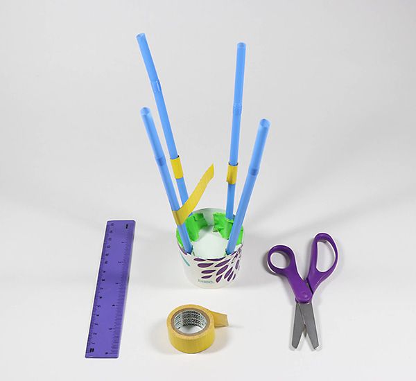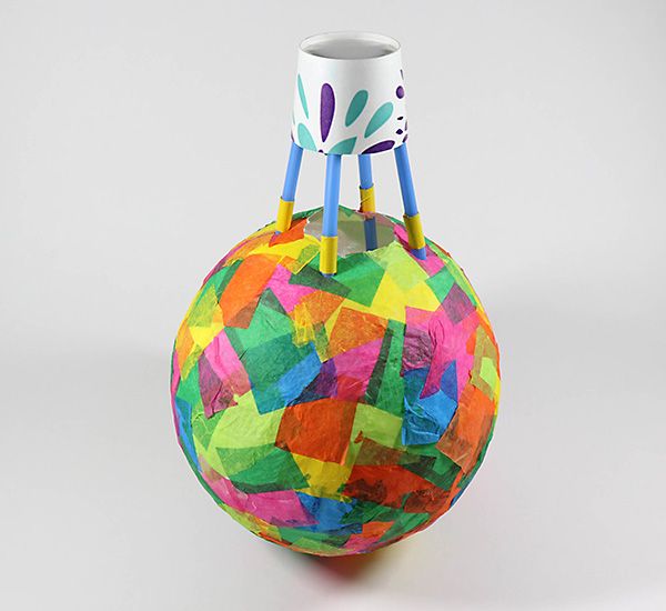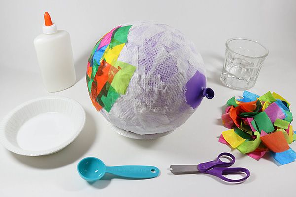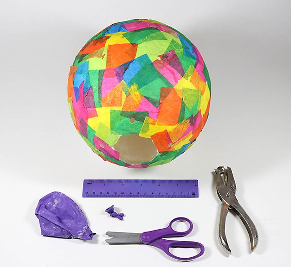 You’ll Need: 4 drinking straws, two 9 oz. (266 mL) paper cups, 11" (28 cm) round balloon, 2 coated paper bowls, ruler, scissors, modeling clay, pen, hole punch, duct tape, 1 cup (237 mL) white glue, tablespoon, water, paintbrush, paper towels, colorful tissue paper, small slips of paper