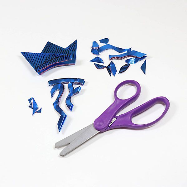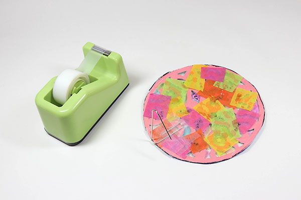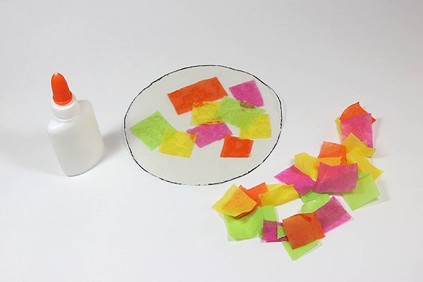 Step 8: Cut tissue paper into 1" (2.5 cm) pieces. Glue to plastic. Let dry. Glue back of mandala to unpapered side of plastic. Trim plastic edges, if needed. Use markers, stickers, or sequins to decorate mandala with virtues and designs about unity.