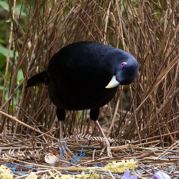 There are lots of awesome animal artists! For example, the male bowerbird creates beautiful nest-like bowers from grass and twigs to attract a mate. He decorates the bower area with objects like flowers, feathers, and shells. Then, when an impressed female sits under his bower, he dances for her. That’s real showmanship!