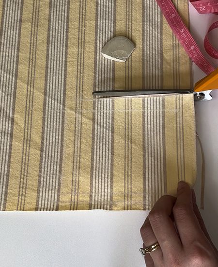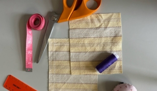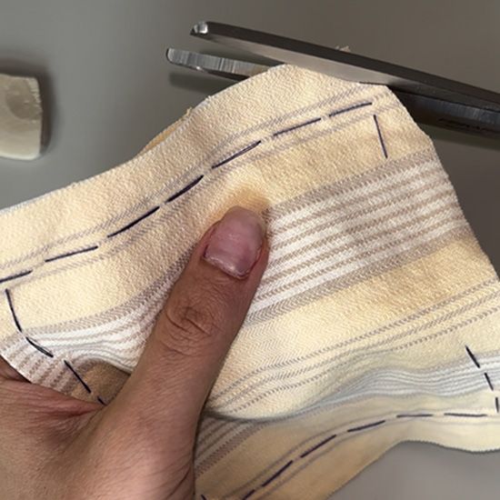 Step 1: If starting with a larger piece of fabric, measure two 5" x 4" (12.7 x 10.2 cm) squares and mark with tailor’s chalk or a pencil. Carefully cut out fabric squares.