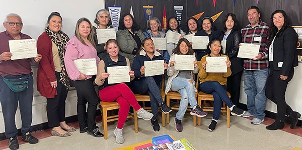Ymasumac (back row, far right) honored adults who took her seven-week Family Empowerment Workshop with certificates of completion. Participants were parents of high-school students in California.