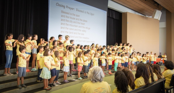 Another important element of Camp Virtues is its focus on the arts. Julie says, “We have a camp songbook and songs that each year relate to the virtues that they’re going to be studying. Our camp song is ‘I Think You’re Wonderful,’ by Red Grammer. So we sing that in the morning when the camp starts. Then at the end of the day, for the last 25 minutes or so, we come together. Each of the classes has two to three minutes to do a little presentation of something that they learned. One class will share a song, one class will share a science experiment they did, one class will show their art project, one group might do a rap about it. So it builds this excitement around it. Then we have a closing prayer.