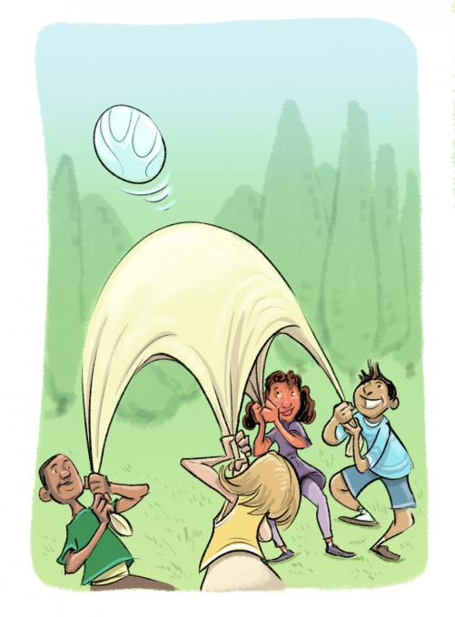 Set up two teams of four. Each person holds one corner of a blanket. One team puts volleyball in center of blanket. They lower blanket, then raise it quickly, so the ball flies up. The other team catches the ball with their blanket and tosses it back. See how many exchanges you can make.