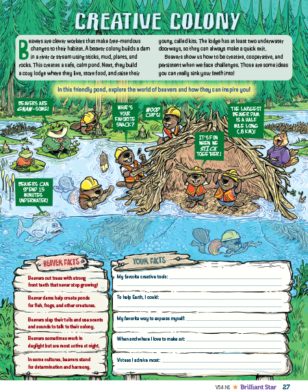 This page introduces the amazing and creative behavior of beavers and shows illustrated beavers creating their lodge. We can learn a lot from beavers! In the activity, facts about these animals are presented, and readers are asked to write about their own creative experiences.