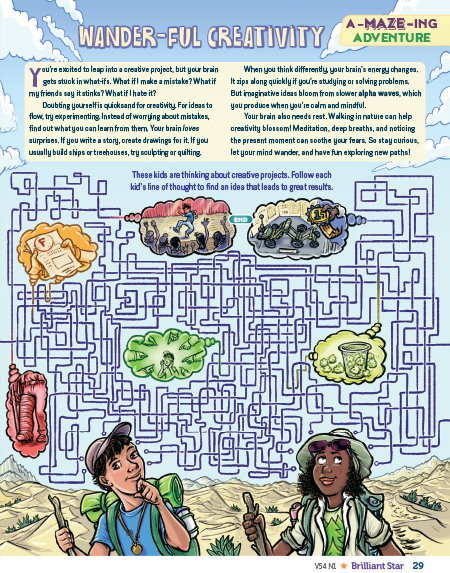 This piece explores different types of brain waves and how they relate to different activities. In the maze, readers choose the correct path that leads from each kid to their positive idea about the creative process.