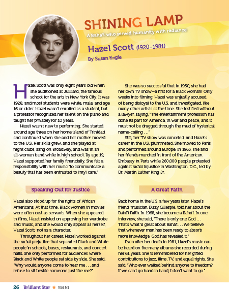 The Shining Lamp feature introduces readers to a heroic Bahá’í from history. This page describes the life and career of Hazel Scott, a pioneering musician, TV personality, and racial justice advocate. Hazel Scott's ideas, experiences, and some inspiring quotes are included.