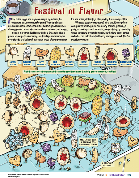 Ask students to share their favorite cookies or treats that aren’t pictured on the page. Make a list on a poster. Are they special family recipes? Can you match a virtue word to each cookie name the kids suggest? (For example, Cheerful Chocolate Chip or Sharing Sugar Cookies)