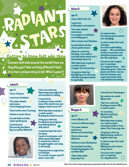 To facilitate a feeling of community among Brilliant Star’s readers (from around the U.S. and the world). In their responses to our reader surveys, kids who are the only Bahá’í in their school or one of just a few Bahá’ís in their area say that Radiant Stars reminds them that they’re not alone, and there are kids like them around the world.