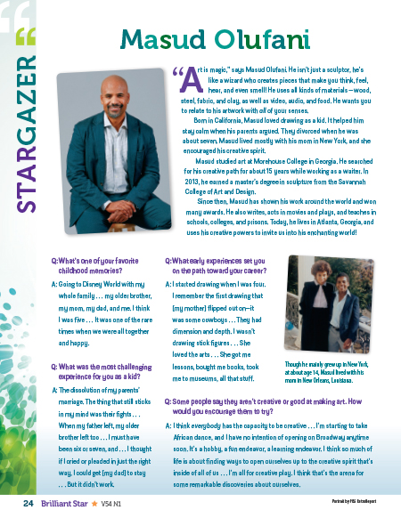 As the tagline (“Questions and Answers with an Inspirational Bahá’í”) suggests, Stargazer spotlights the life, work, and perspectives of an adult Bahá’í who can be a role model. Stargazers work in fields that are relevant to the theme of each issue. In this issue about creativity, artist, actor, and writer Masud Olufani talks about his mother’s encouragement, the importance of creative play, the impact of art on social change, and how the Baha’i teachings may be manifested in artistic works.