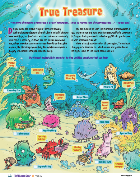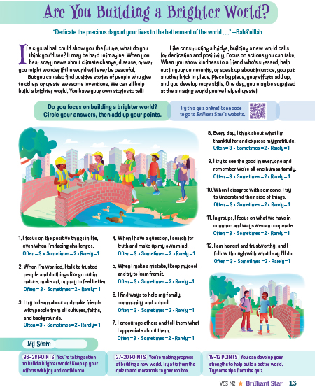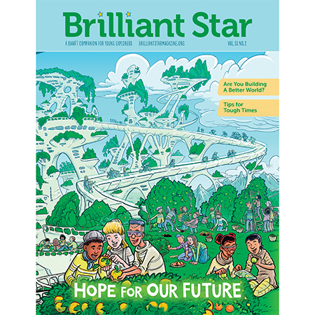 This guide is a tool to assist teachers of children’s classes and junior youth animators in using Brilliant Star’s “Hope for Our Future” issue in the classroom. While Brilliant Star is developed for kids aged 7-12, many younger and older kids enjoy learning from it. Activities can be adapted to engage ages 4-14. You’re invited to share your own ideas in our Facebook group, Brilliant Star Idea Exchange.
