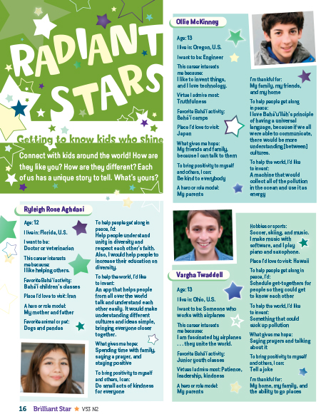 The “Radiant Stars” feature is intended to facilitate a feeling of community among Brilliant Star’s readers. In their responses to our reader surveys, kids who are the only Bahá’í in their school or one of just a few Bahá’ís in their area say that “Radiant Stars” reminds them that they’re not alone, and there are kids like them around the world.