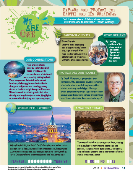 The Bahá’í Faith provides a unifying vision of society that meets humanity’s needs for oneness, equality, and justice. It asserts that the welfare of individuals is connected to the welfare of society. This issue provides tools to encourage kids in refining their characters, fortifying themselves against tests, and building unity in their families, schools, and communities.