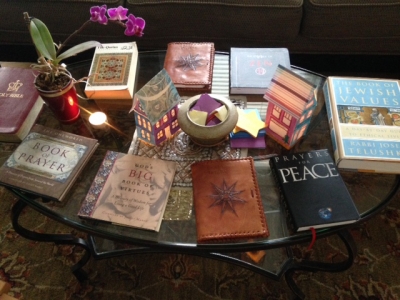 Put out books from different faiths, and some non-denominational ones that share inspiring teachings or virtues. Also include pretty decorations like decorative mats, flowers, and a handmade craft like the battery powered paper houses in this link: