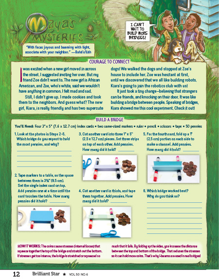 Maya tells a story of building a bridge to race unity by taking small steps toward friendliness. Then she presents a science experiment about creating a strong bridge from sturdy paper and other common materials.