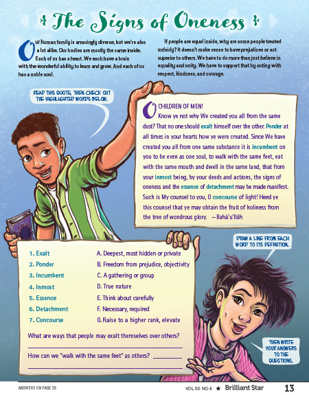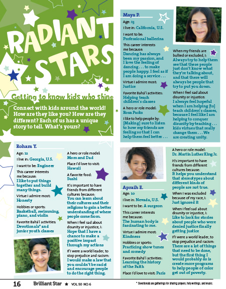 To facilitate a feeling of community among Brilliant Star’s readers (from around the U.S. and the world). In their responses to our reader surveys, kids who are the only Bahá’í in their school or one of just a few Bahá’ís in their area say that Radiant Stars reminds them that they’re not alone, and there are kids like them around the world.