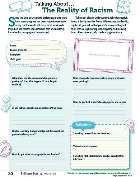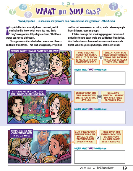 The purpose of this activity is to help readers recognize prejudice in their daily lives, and to empower them to speak up against it. Three scenarios are presented in which a fictional kid reacts to a racist idea. Readers draft a response they might make in that situation.