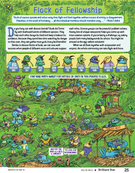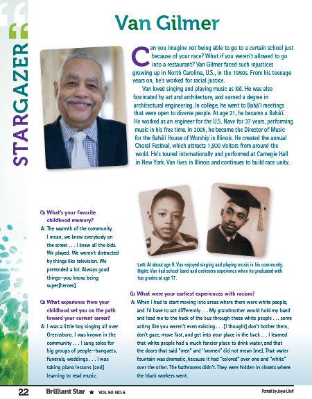 As the tagline (“Questions and Answers with an Inspirational Bahá’í”) suggests, Stargazer articles spotlight the life, work, and kid-friendly perspectives of adult Bahá’ís who kids can look to as a role model. Stargazers work in fields that are relevant to the theme of each issue. In this issue about “Hearts in Harmony,” choir director Van Gilmer describes his work using music as a tool to build community among people of different racial, ethnic, and religious backgrounds.