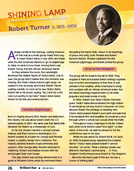 - Robert Turner was the first African American Bahá’í. How do you think it feels to be the first person to do something new?
