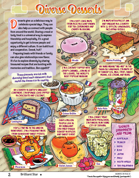This piece teaches readers about the unifying benefits of sharing and preparing tasty treats with people from other cultures. Readers also learn about delicious desserts from around the world.