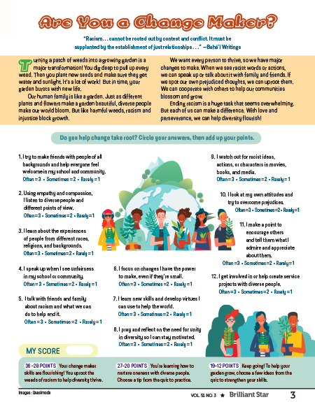 This page encourages kids to be proactive in making changes within themselves, in their families, and their communities. The quiz promotes self-reflection and offers concrete examples of actions kids can take to strengthen their change-making skills.