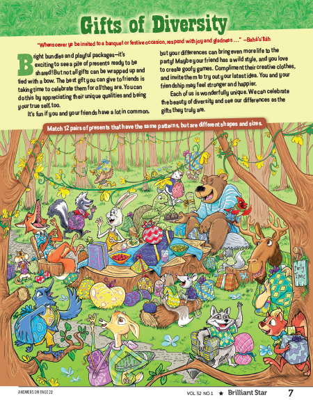 Through a fun gift-matching activity, this page explores the similarities and differences between all people. It encourages readers to celebrate the diversity of their friends and communities and to see diversity as a gift.