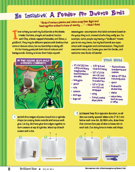 This page emphasizes how having diverse friends is fun and reduces stereotyping. Readers make a bird feeder to attract diverse birds.