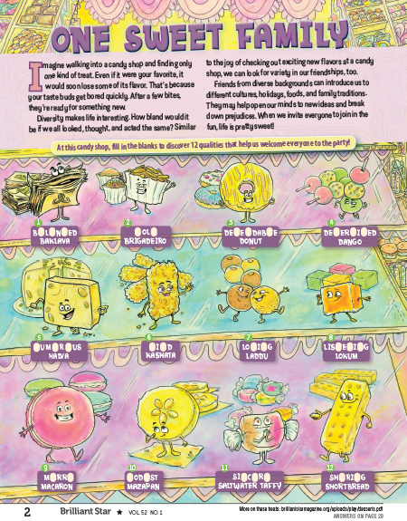 This page helps kids explore the sweetness diversity brings to our human family. It introduces readers to treats from around the world, and encourages them to find qualities that help us welcome friends of all backgrounds.